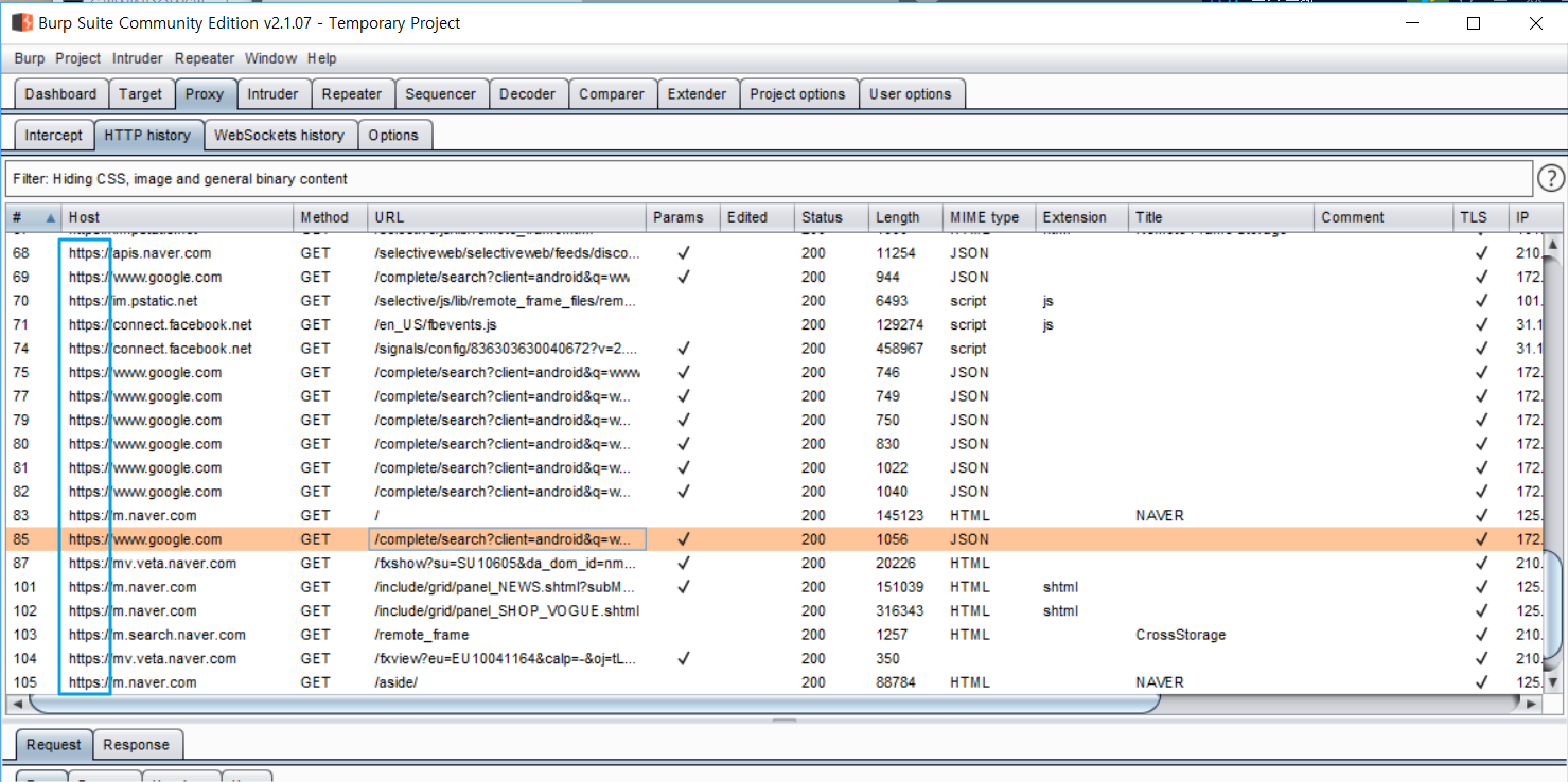 Burp Suite에서 디바이스에서 사용하는 http뿐 아니라 https패킷들 또한 캡쳐할 수 있다.