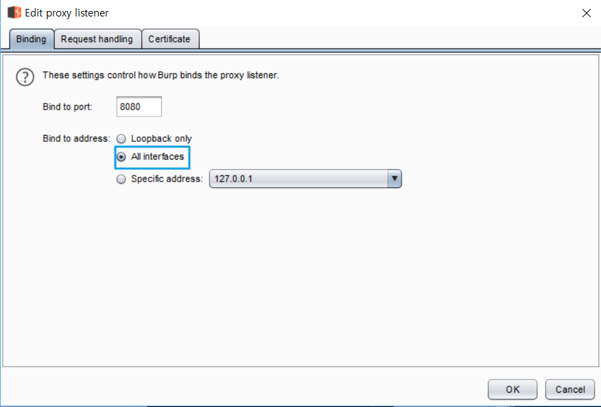 [1] Burp Suite 실행 후 모든 인터페이스로부터 수신을 받도록 설정한다.