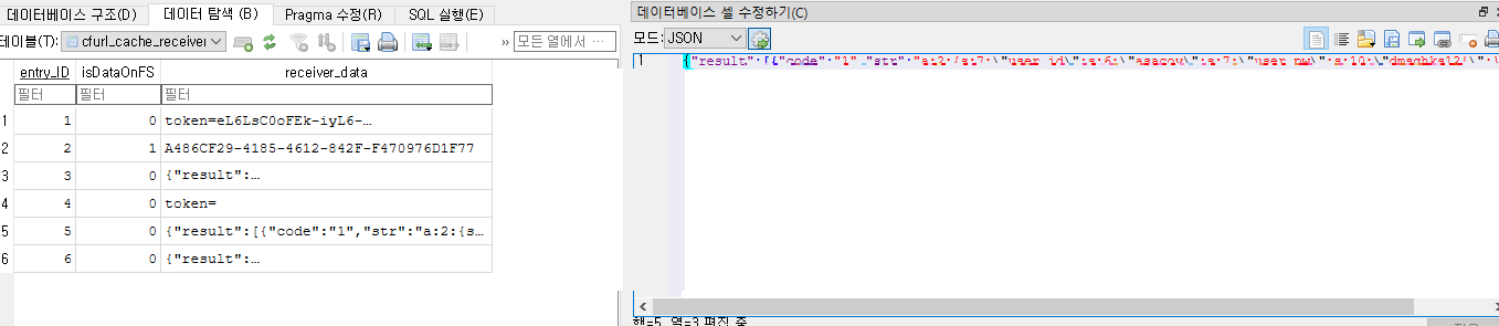 SQLite를 활용해 데이터를 확인하였고 앱 로그인 할 때 사용한 계정과 비밀번호가 저장되어있음